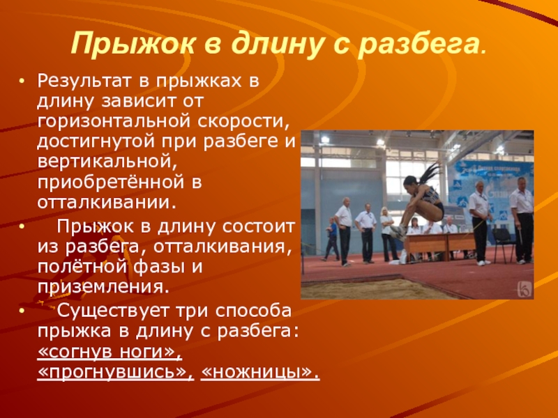 Существует три способа прыжка в длину с разбега: «согнув ноги», «прогнувшись», «ножницы».