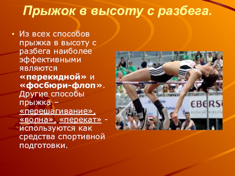 разбега наиболее эффективными являются «перекидной» и «фосбюри-флоп». Другие способы прыжка – «перешагивание», «волна», «перекат» - используются как средства спортивной подготовки.