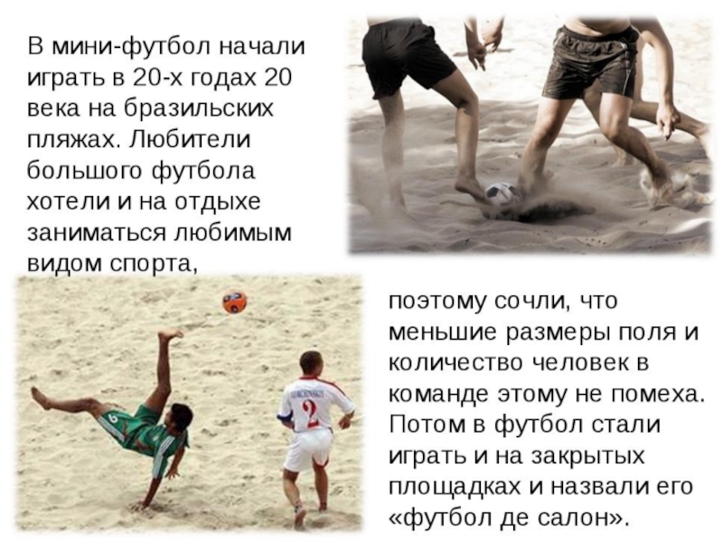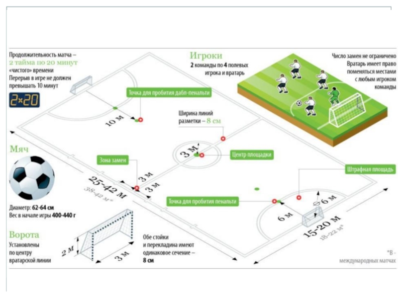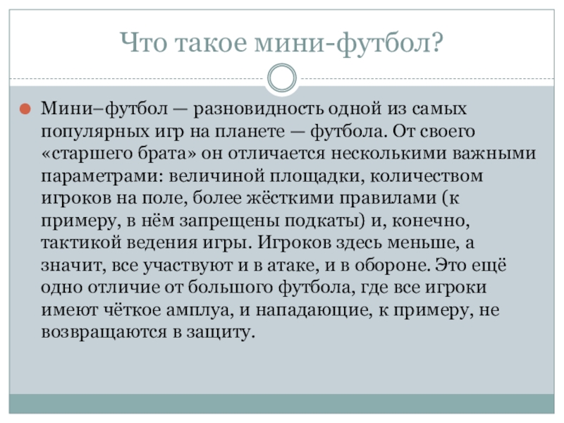 планете — футбола. От своего «старшего брата» он отличается несколькими важными параметрами: величиной площадки, количеством игроков на поле, более жёсткими правилами (к примеру, в нём запрещены подкаты) и, конечно, тактикой ведения игры. Игроков здесь меньше, а значит, все участвуют и в атаке, и в обороне. Это ещё одно отличие от большого футбола, где все игроки имеют чёткое амплуа, и нападающие, к примеру, не возвращаются в защиту.