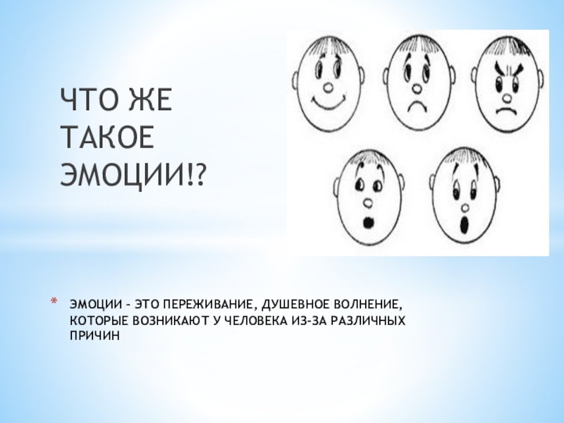 ЧТО ЖЕ ТАКОЕ ЭМОЦИИ!?ЭМОЦИИ – ЭТО ПЕРЕЖИВАНИЕ, ДУШЕВНОЕ ВОЛНЕНИЕ, КОТОРЫЕ ВОЗНИКАЮТ У ЧЕЛОВЕКА ИЗ-ЗА РАЗЛИЧНЫХ ПРИЧИН