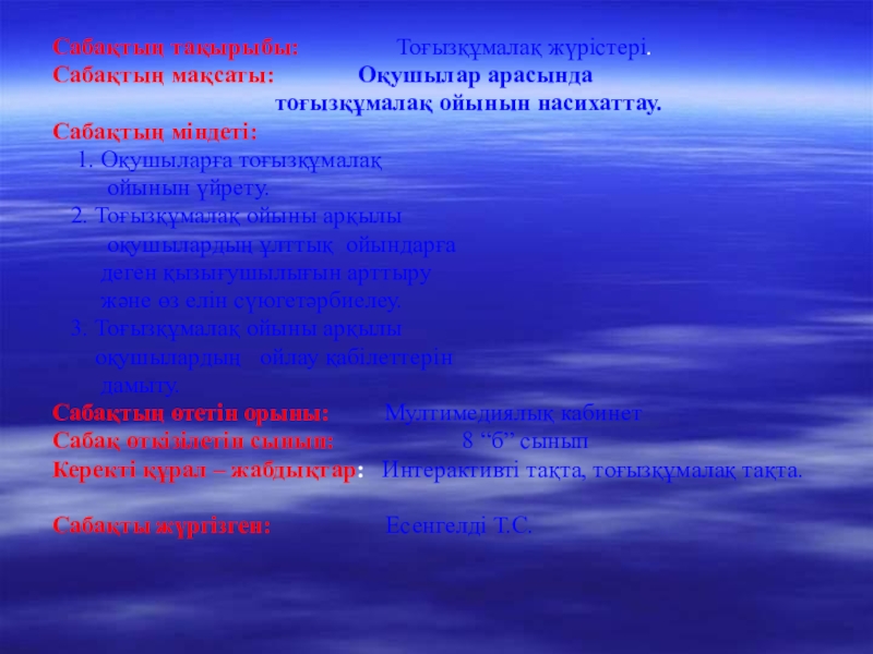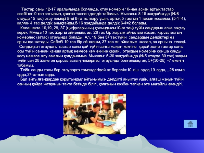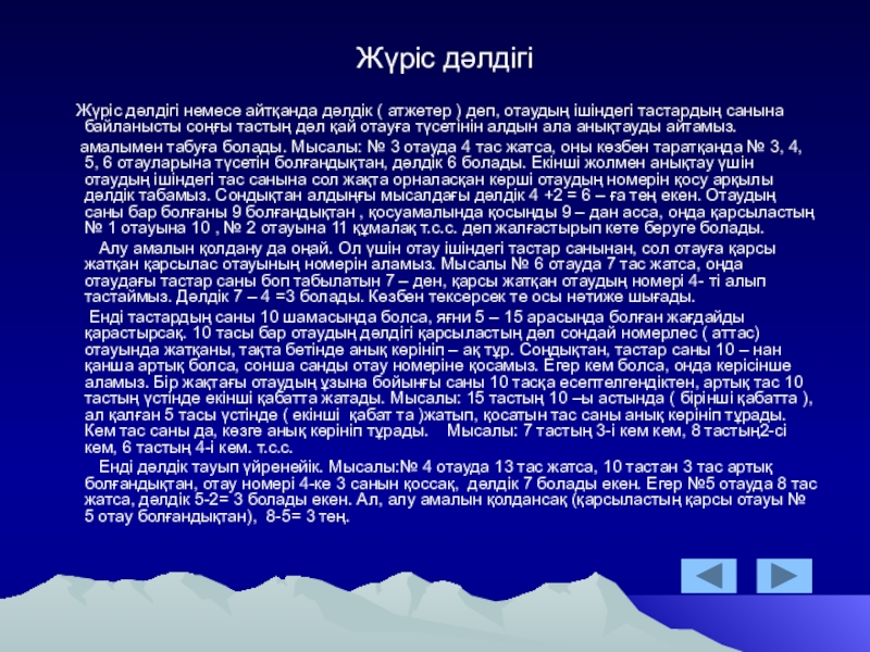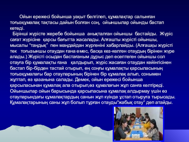 1. Алғашқы жүрістерді алдыңғы шептің отауларынан жүріп, ортаңғы әсіресе артқы шеп отауларының күшін сақтауға (тастарының көбеймеуіне) тырысу.