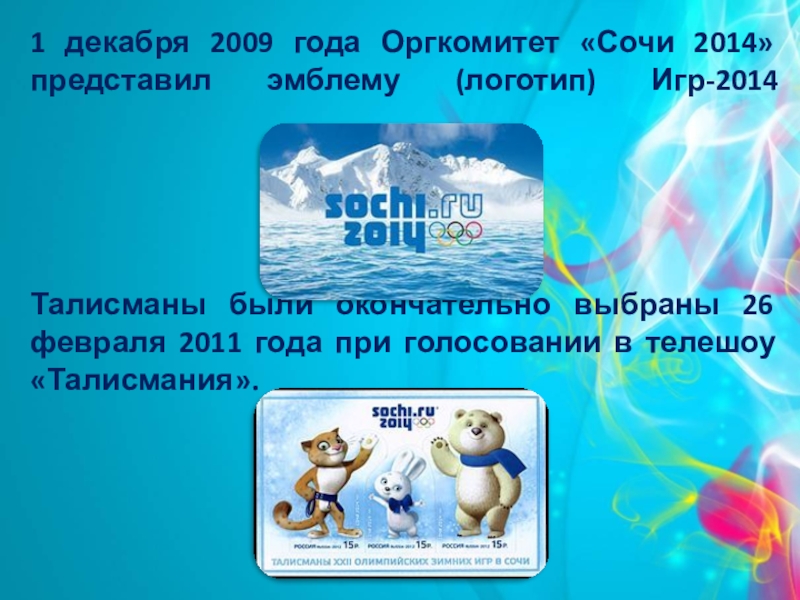 1 декабря 2009 года Оргкомитет «Сочи 2014» представил эмблему (логотип) Игр-2014      Талисманы