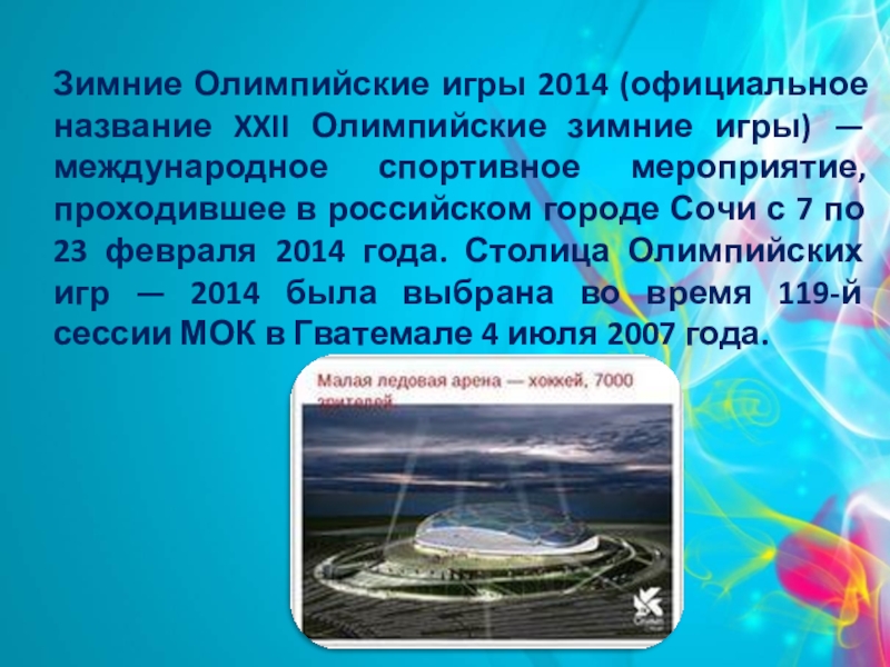 Слайд 2Зимние Олимпийские игры 2014 (официальное название XXII Олимпийские зимние игры) —
