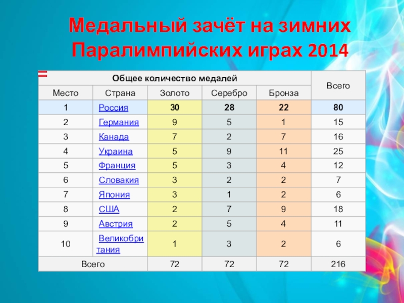 Слайд 16Медальный зачёт на зимних Паралимпийских играх 2014