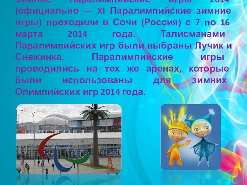 Слайд 12Зимние Паралимпийские игры 2014 (официально — XI Паралимпийские зимние игры) проходили