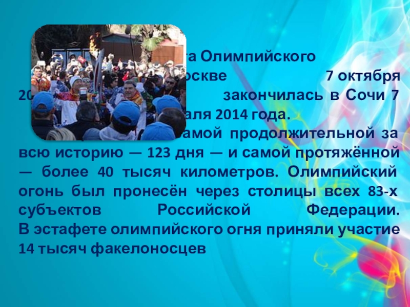 закончилась в Сочи 7 февраля 2014 года. Эстафета стала самой продолжительной за всю историю — 123 дня — и самой протяжённой — более 40 тысяч километров. Олимпийский огонь был пронесён через столицы всех 83-х субъектов Российской Федерации. В эстафете олимпийского огня приняли участие 14 тысяч факелоносцев