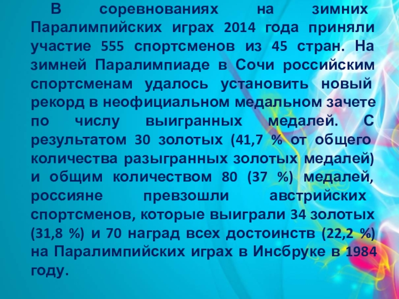 спортсменов из 45 стран. На зимней Паралимпиаде в Сочи российским спортсменам удалось установить новый рекорд в неофициальном медальном зачете по числу выигранных медалей. С результатом 30 золотых (41,7 % от общего количества разыгранных золотых медалей) и общим количеством 80 (37 %) медалей, россияне превзошли австрийских спортсменов, которые выиграли 34 золотых (31,8 %) и 70 наград всех достоинств (22,2 %) на Паралимпийских играх в Инсбруке в 1984 году.