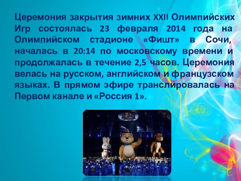 Слайд 8Церемония закрытия зимних XXII Олимпийских Игр состоялась 23 февраля 2014 года