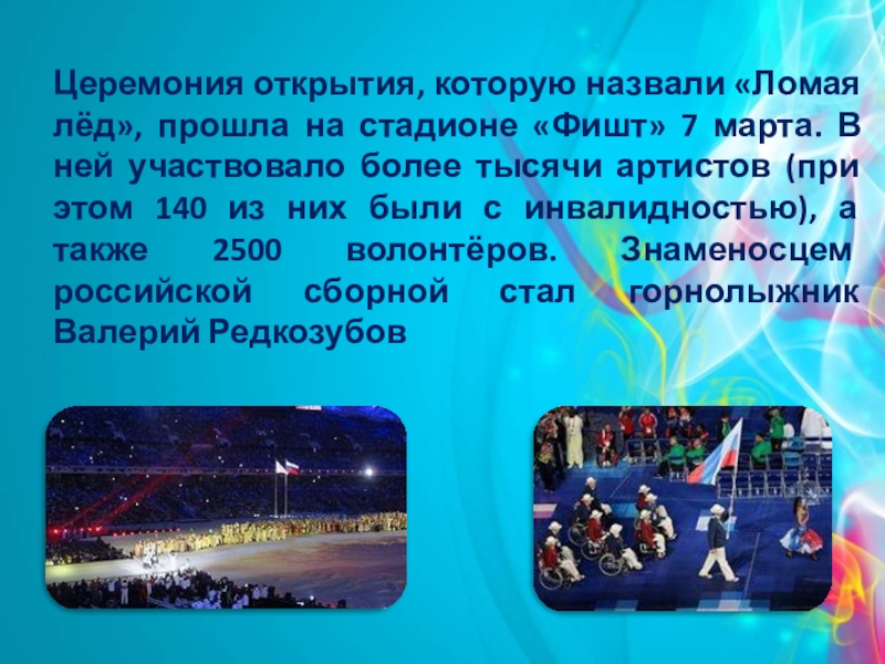марта. В ней участвовало более тысячи артистов (при этом 140 из них были с инвалидностью), а также 2500 волонтёров. Знаменосцем российской сборной стал горнолыжник Валерий Редкозубов
