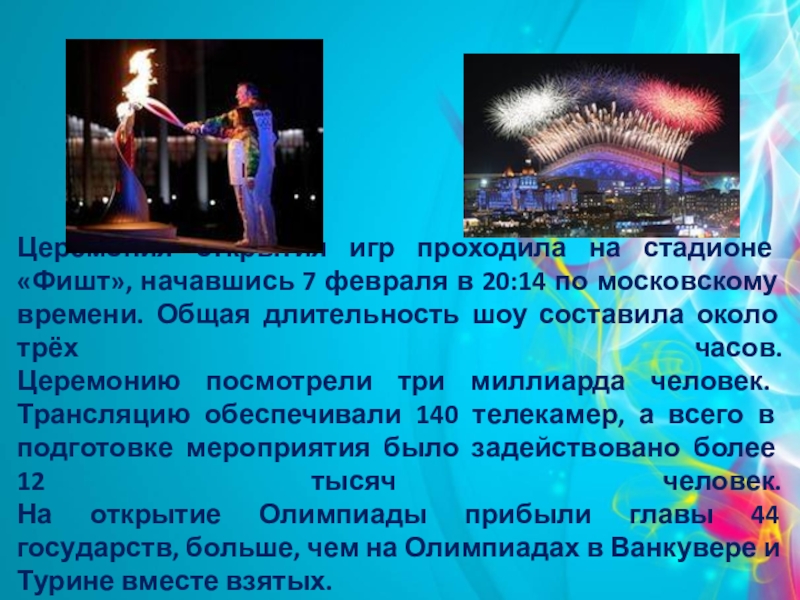 Слайд 5Церемония открытия игр проходила на стадионе «Фишт», начавшись 7 февраля в