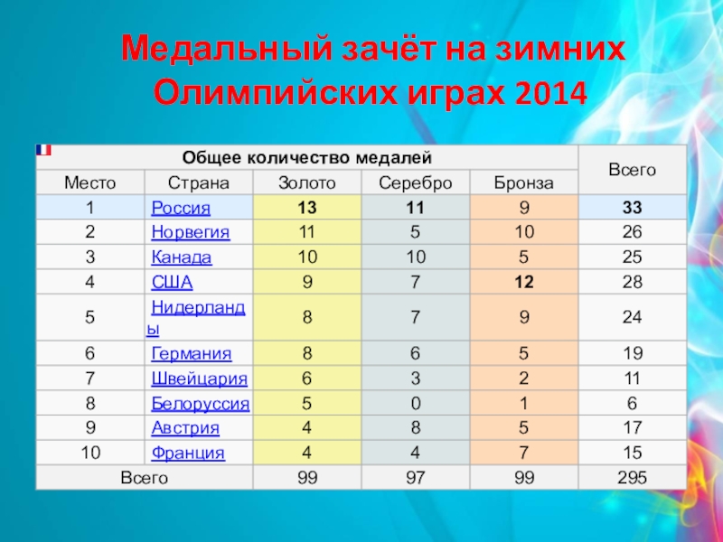Слайд 10 Медальный зачёт на зимних Олимпийских играх 2014