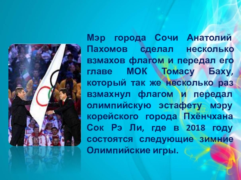 Мэр города Сочи Анатолий Пахомов сделал несколько взмахов флагом и передал его главе МОК Томасу Баху, который