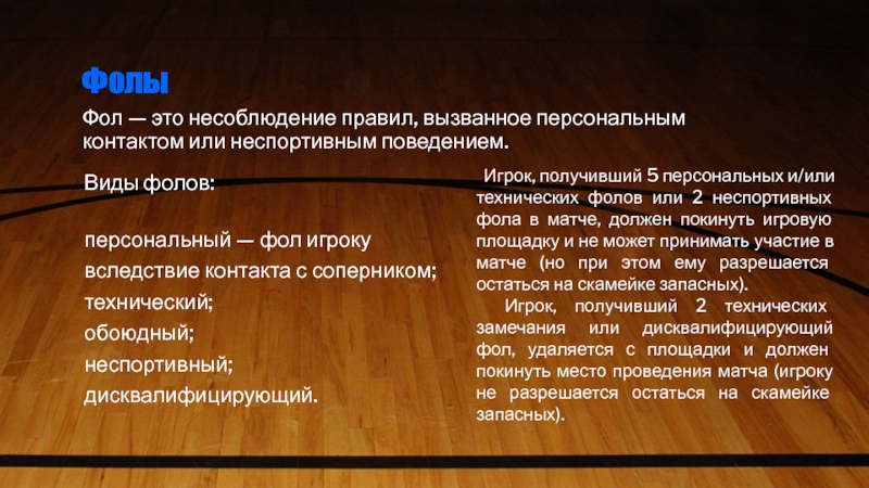 Игрок, получивший 5 персональных и/или технических фолов или 2 неспортивных фола в матче, должен покинуть игровую площадку и не может принимать участие в матче (но при этом ему разрешается остаться на скамейке запасных).