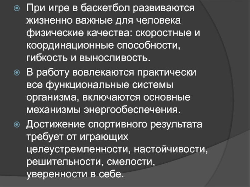 При игре в баскетбол развиваются жизненно важные для человека физические качества: скоростные и координационные способности, гибкость и