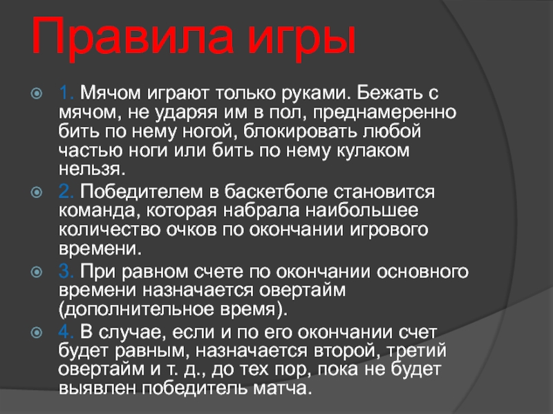 Правила игры1. Мячом играют только руками. Бежать с мячом, не ударяя им в пол, преднамеренно бить по