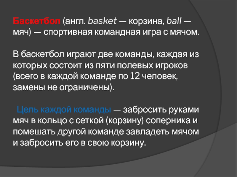 Баскетбол (англ. basket — корзина, ball — мяч) — спортивная командная игра с мячом.  В баскетбол играют две команды, каждая из которых состоит