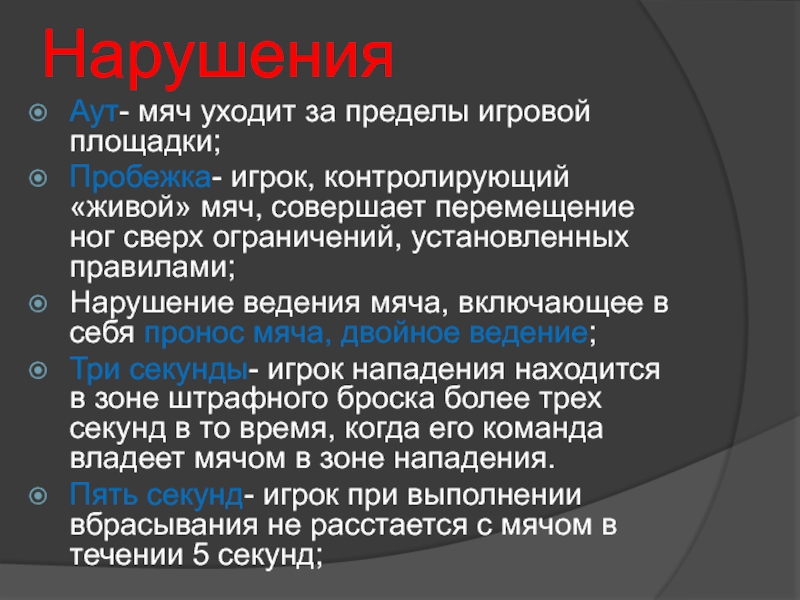 НарушенияАут- мяч уходит за пределы игровой площадки;Пробежка- игрок, контролирующий «живой» мяч, совершает перемещение ног сверх ограничений, установленных