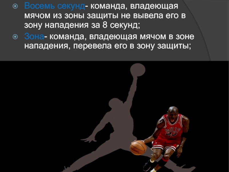 Слайд 6Восемь секунд- команда, владеющая мячом из зоны защиты не вывела его