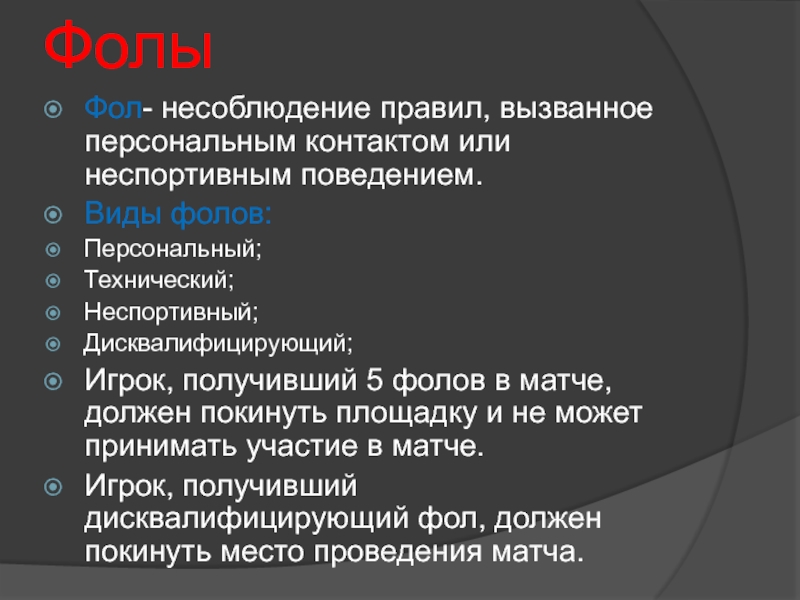 ФолыФол- несоблюдение правил, вызванное персональным контактом или неспортивным поведением.Виды фолов:Персональный;Технический;Неспортивный;Дисквалифицирующий;Игрок, получивший 5 фолов в матче, должен покинуть