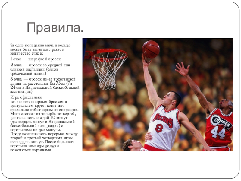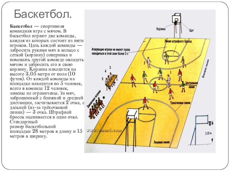 из которых состоит из пяти игроков. Цель каждой команды — забросить руками мяч в кольцо с сеткой (корзину) соперника и помешать другой команде овладеть мячом и забросить его в свою корзину. Kорзина находится на высоте 3,05 метра от пола (10 футов). От каждой команды на площадке находится по 5 человек, всего в команде 12 человек, замены не ограничены. За мяч, заброшенный с ближней и средней дистанции, засчитывается 2 очка, с дальней (из-за трёхочковой линии) — 3 очка. Штрафной бросок оценивается в одно очко. Стандартный размер баскетбольной площадки 28 метров в длину и 15 метров в ширину.