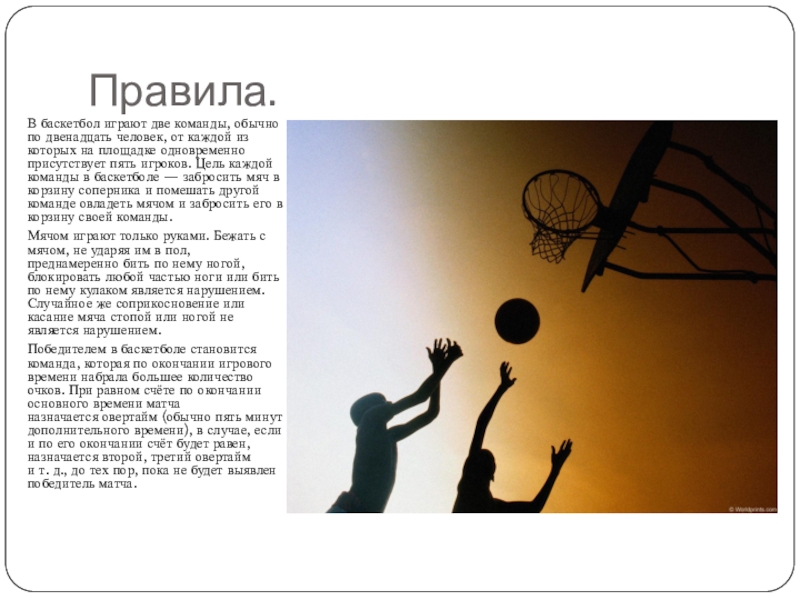 Баскетбол — спортивная командная игра с мячом. В баскетбол играют две команды, каждая