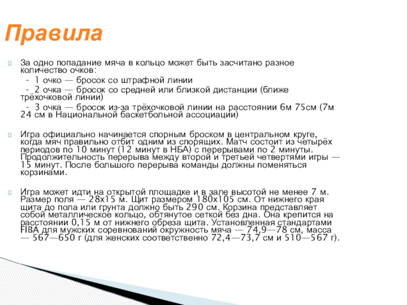 Всего в команде 12 человек, замены не ограничены. За мяч, заброшенный с ближней и средней дистанции, засчитывается 2 очка, с дальней — 3 очка. Штрафной бросок оценивается в 1 очко. Стандартный размер баскетбольной площадки 28 метров в длину и 15 метров в ширину.
