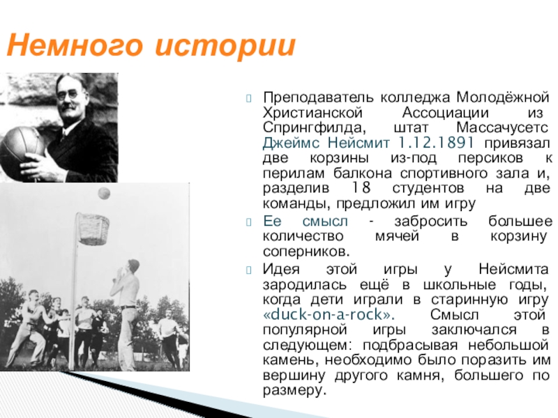 Нейсмит 1.12.1891 привязал две корзины из-под персиков к перилам балкона спортивного зала и, разделив 18 студентов на две команды, предложил им игру