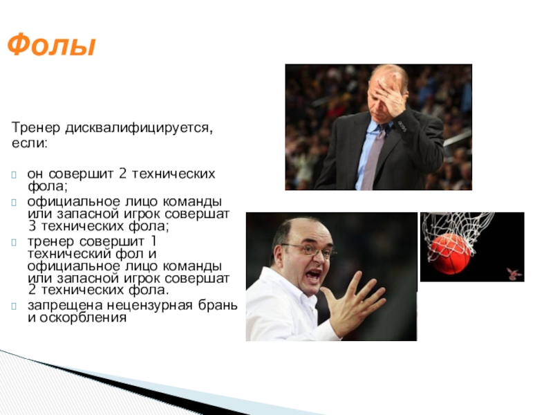 тренер совершит 1 технический фол и официальное лицо команды или запасной игрок совершат 2 технических фола.