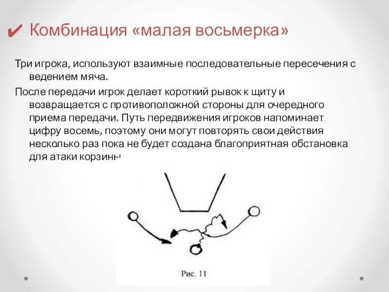 передачи игрок делает короткий рывок к щиту и возвращается с противоположной стороны для очередного приема передачи. Путь передвижения игроков напоминает цифру восемь, поэтому они могут повторять свои действия несколько раз пока не будет создана благоприятная обстановка для атаки корзины