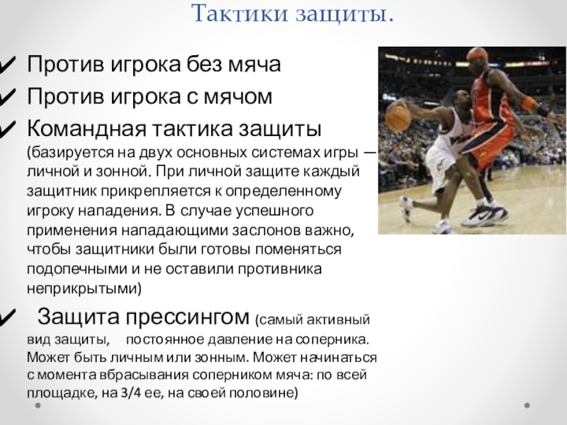 на двух основных системах игры — личной и зонной. При личной защите каждый защитник прикрепляется к определенному игроку нападения. В случае успешного применения нападающими заслонов важно, чтобы защитники были готовы поменяться подопечными и не оставили противника неприкрытыми)