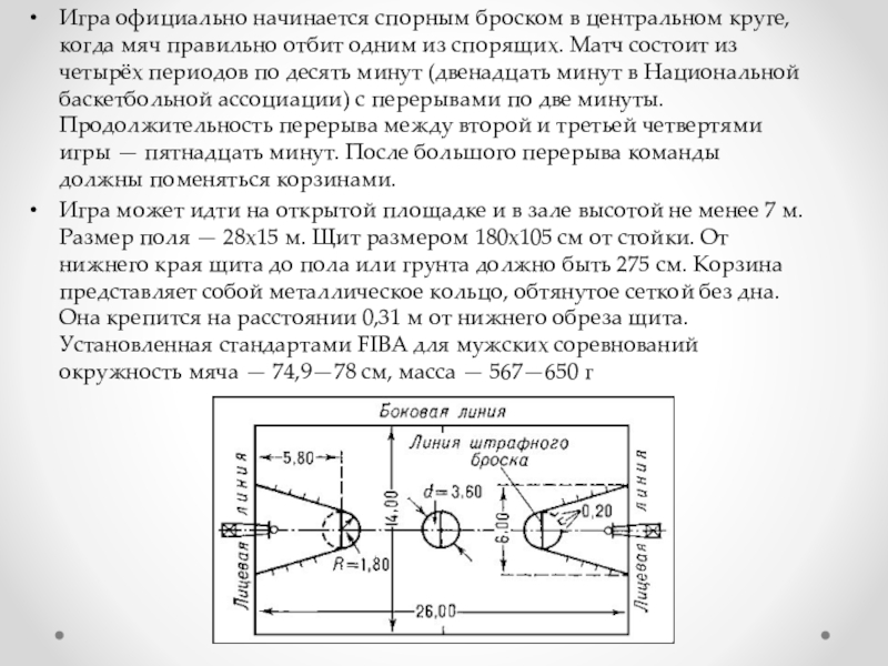 Слайд 4Игра официально начинается спорным броском в центральном круге, когда мяч правильно