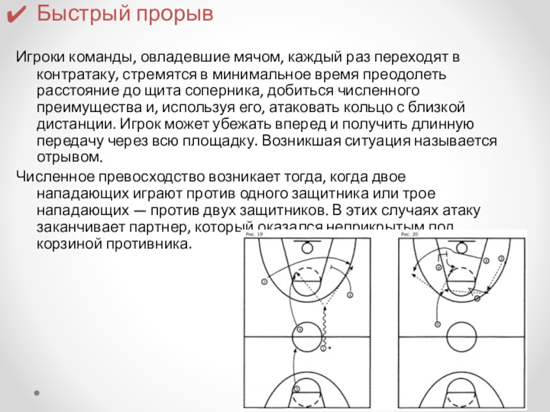 Численное превосходство возникает тогда, когда двое нападающих играют против одного защитника или трое нападающих — против двух защитников. В этих случаях атаку заканчивает партнер, который оказался неприкрытым под корзиной противника.