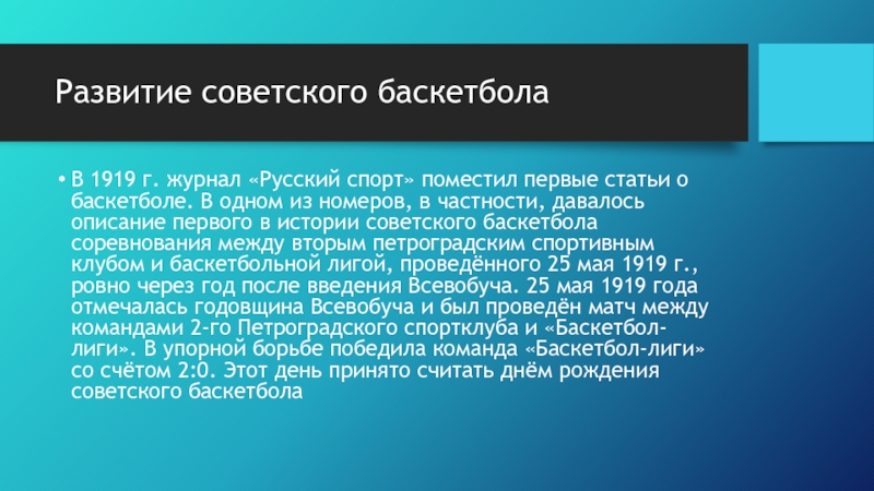 Развитие советского баскетболаВ 1919 г. журнал «Русский спорт» поместил первые статьи о баскетболе. В одном из номеров,