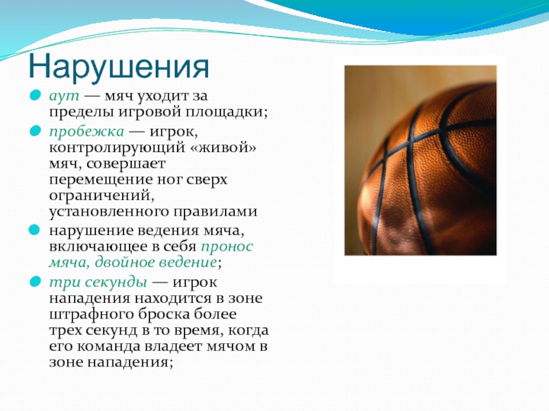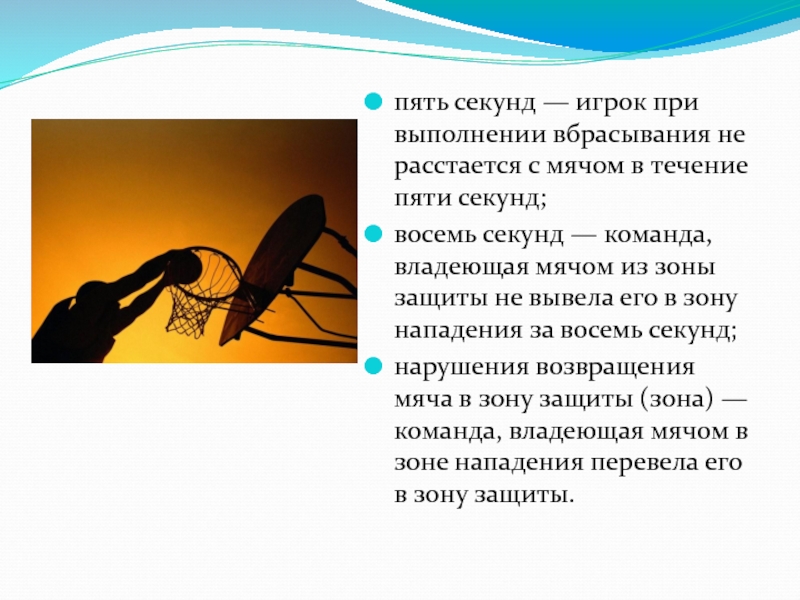 Слайд 13пять секунд — игрок при выполнении вбрасывания не расстается с мячом в