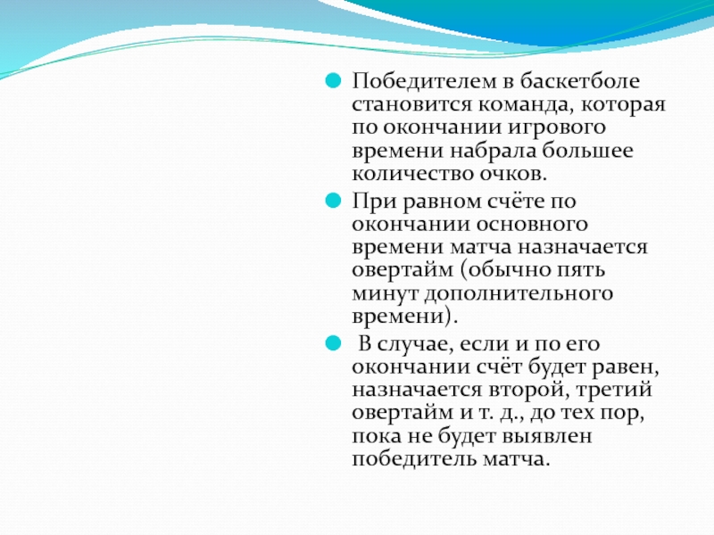 Слайд 9Победителем в баскетболе становится команда, которая по окончании игрового времени набрала