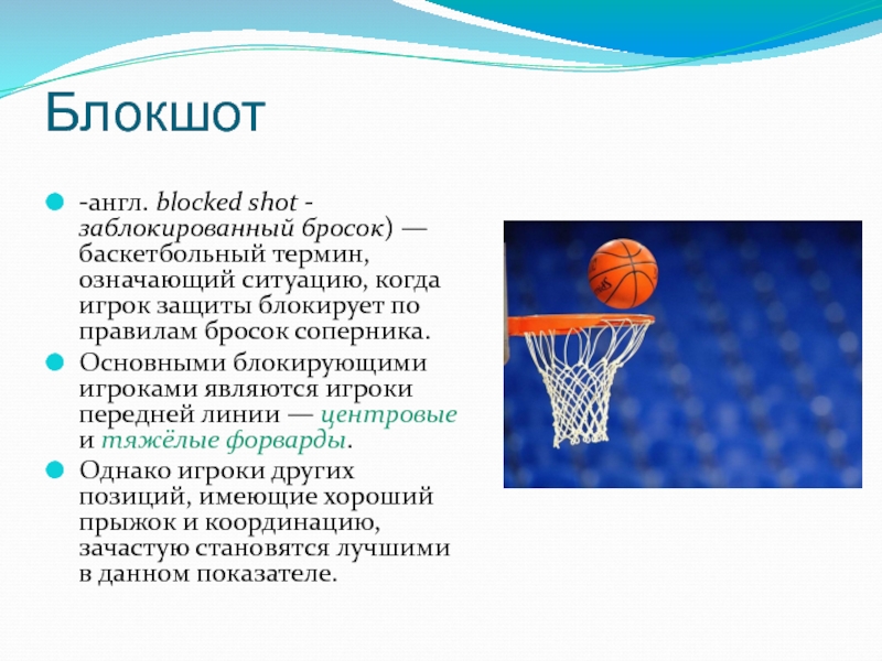-англ. blocked shot - заблокированный бросок) — баскетбольный термин, означающий ситуацию, когда игрок