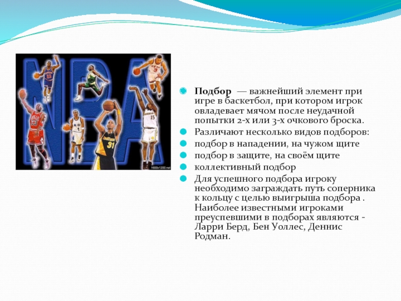 Слайд 17Подбор — важнейший элемент при игре в баскетбол, при котором игрок
