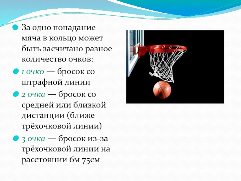 Слайд 10За одно попадание мяча в кольцо может быть засчитано разное количество