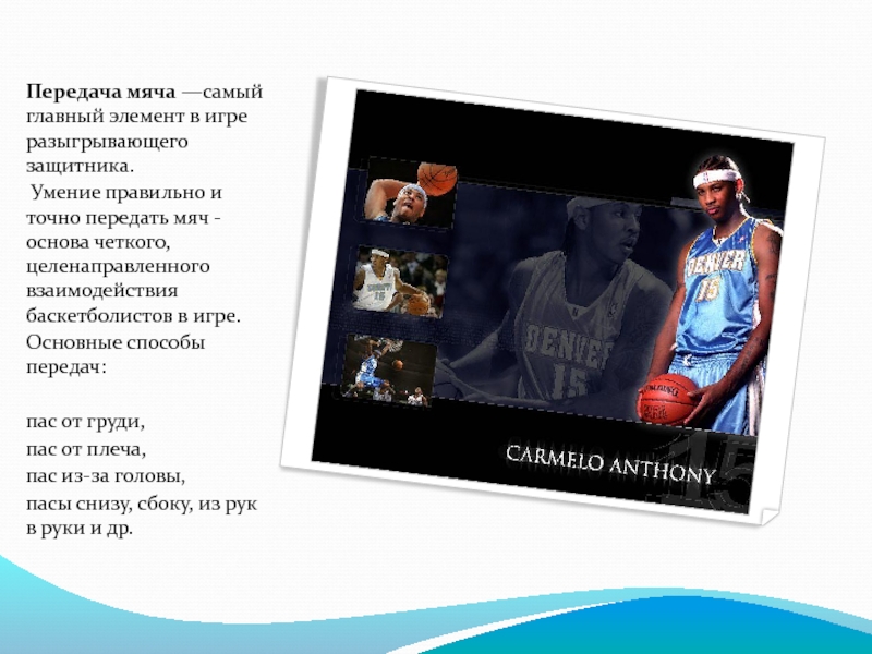 Слайд 16Передача мяча —самый главный элемент в игре разыгрывающего защитника.