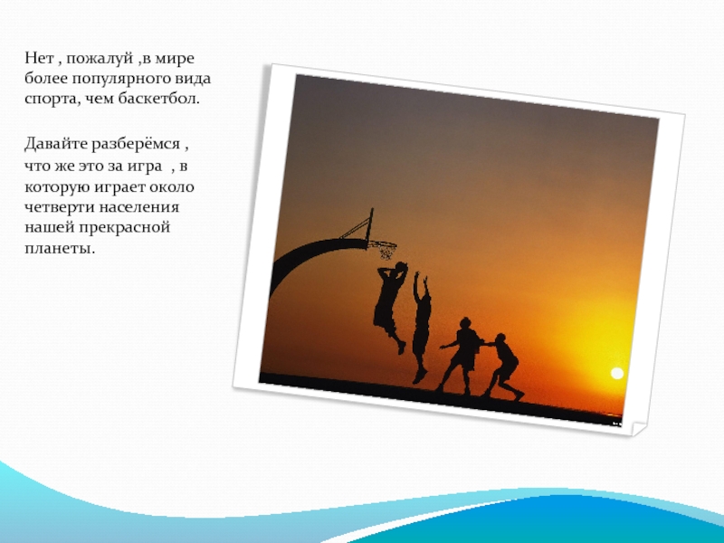 Слайд 2Нет , пожалуй ,в мире более популярного вида спорта, чем баскетбол.