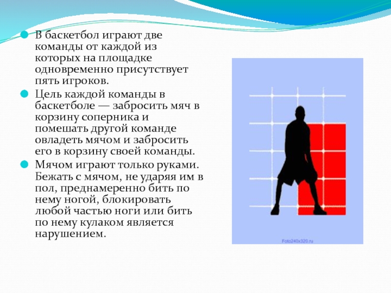 Цель каждой команды в баскетболе — забросить мяч в корзину соперника и помешать другой команде овладеть мячом и забросить его в корзину своей команды.