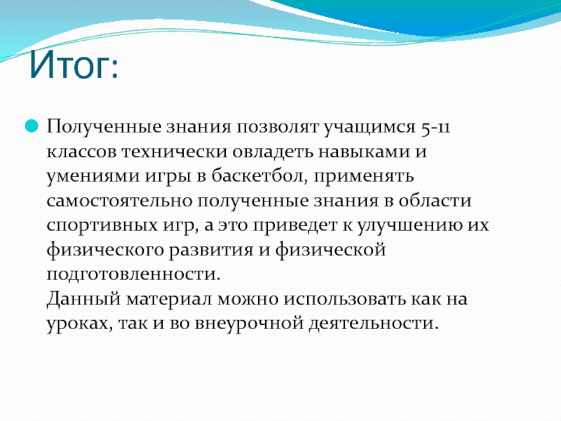 игры в баскетбол, применять самостоятельно полученные знания в области спортивных игр, а это приведет к улучшению их физического развития и физической подготовленности.