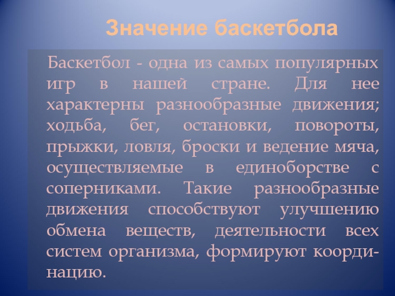 стране. Для нее характерны разнообразные движения; ходьба, бег, остановки, повороты, прыжки, ловля, броски и ведение мяча, осуществляемые в единоборстве с соперниками. Такие разнообразные движения способствуют улучшению обмена веществ, деятельности всех систем организма, формируют коорди- нацию.