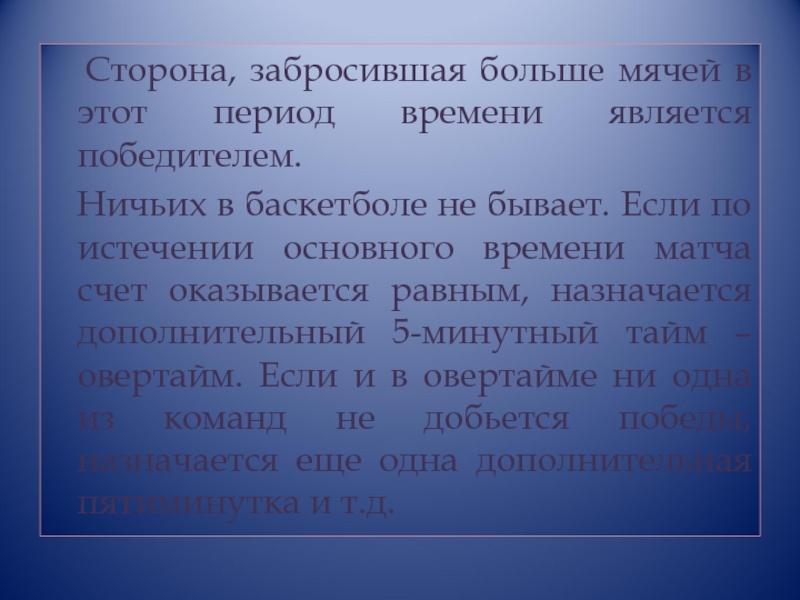 Ничьих в баскетболе не бывает. Если по истечении основного времени матча счет оказывается равным, назначается дополнительный 5-минутный тайм – овертайм. Если и в овертайме ни одна из команд не добьется победы, назначается еще одна дополнительная пятиминутка и т.д.