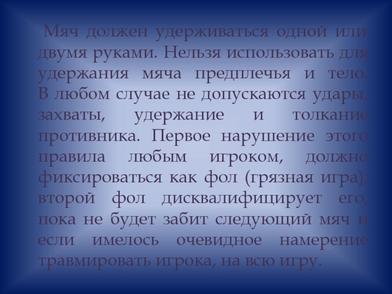 Слайд 11 Мяч должен удерживаться одной или двумя руками. Нельзя использовать