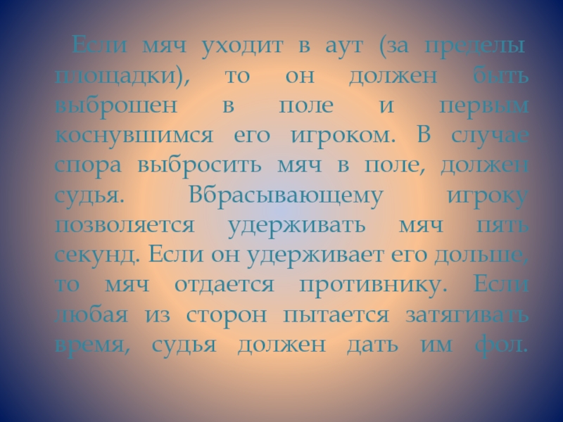 Слайд 12 Если мяч уходит в аут (за пределы площадки), то