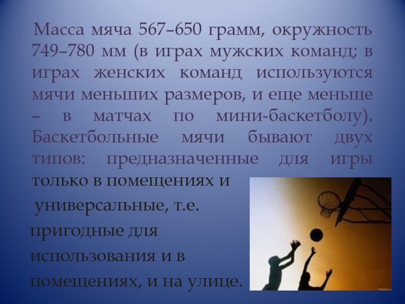 мужских команд; в играх женских команд используются мячи меньших размеров, и еще меньше – в матчах по мини-баскетболу). Баскетбольные мячи бывают двух типов: предназначенные для игры только в помещениях и