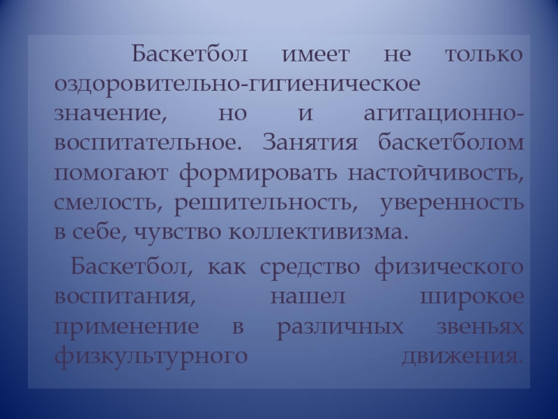 Слайд 16 Баскетбол имеет не только оздоровительно-гигиеническое значение, но и агитационно-воспитательное.