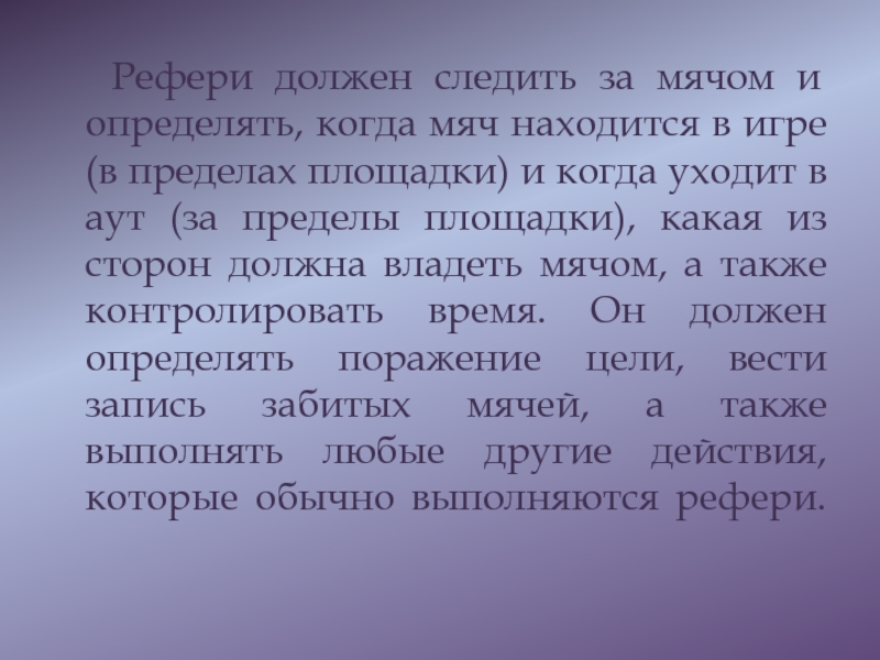 Слайд 13 Рефери должен следить за мячом и определять, когда мяч