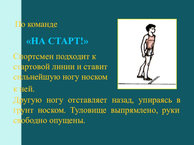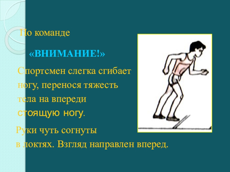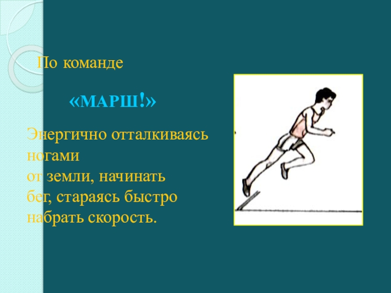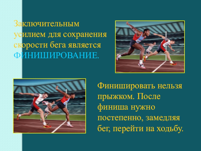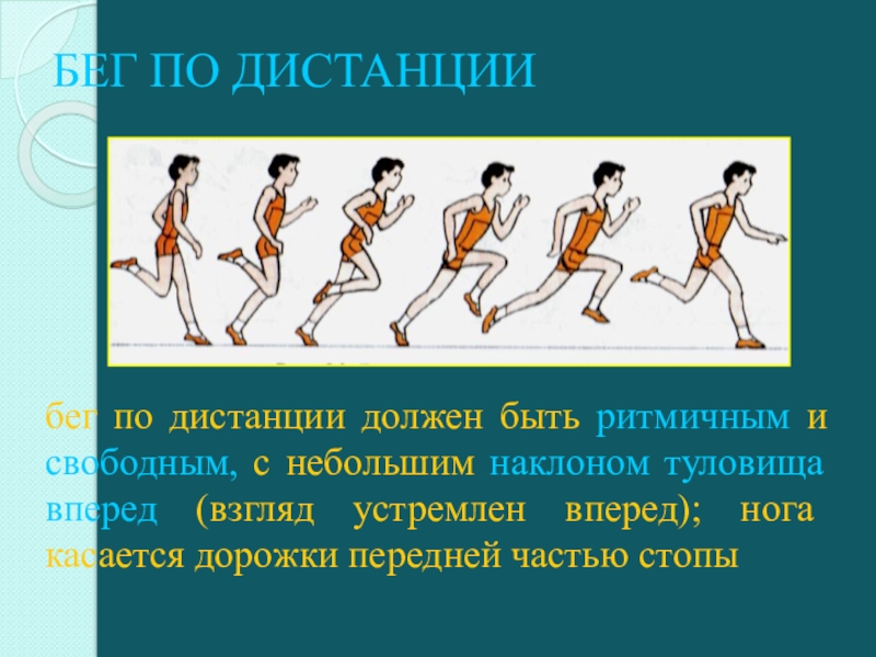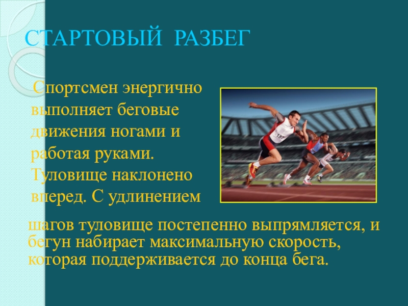 шагов туловище постепенно выпрямляется, и бегун набирает максимальную скорость, которая поддерживается до конца бега.